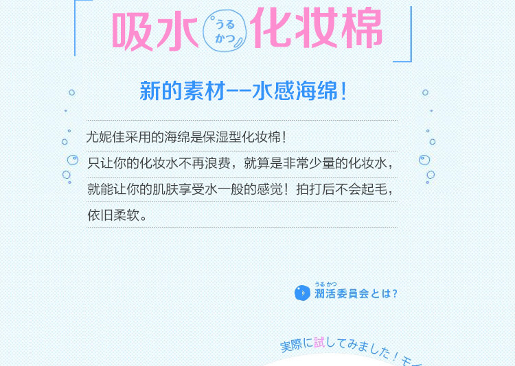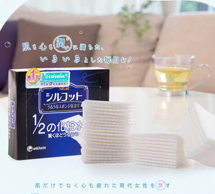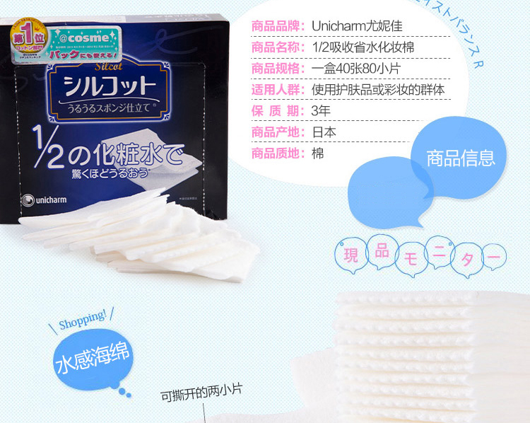●请不要用于化妆以外的用途。●不适合肌肤时,请停止使用。●本化妆棉用通常1/2量的化妆水就可以产生令人惊讶的润爽效果。●采用新开发的润滑海绵材料。●本化妆棉可以将化妆水完全送入肌肤,所以用通常1/2量的化妆水就可以从粉扑产生令人惊讶的润爽效果,能够用于轻拍皮肤、护肤。●极精细表面能够像黏在皮肤上一样贴紧肌肤,所以也推荐用于护肤。●而且配合了使肌肤触感变好的保湿成分。采用首创柔滑材料,能够呵护您的肌肤。【使用方法】●轻拍皮肤1.将大约通常一半量的化妆水在化妆棉表面展开。※注意不要使用过量化妆水。之后会溢出来。2.从与肌肤垂直方向轻柔地有节奏地轻拍皮肤使其渗入肌肤。●护肤轻拍皮肤后,以化妆水不足的地方为中心补充化妆水,沿打孔虚线将化妆棉一分为二,贴在担心的地方。※由于是2片1组,可以分开使用。进行揉搓会让化妆水更容易展开。※根据您的喜好,可以沿打孔虚线将化妆棉分开使用或一片一片地使用。