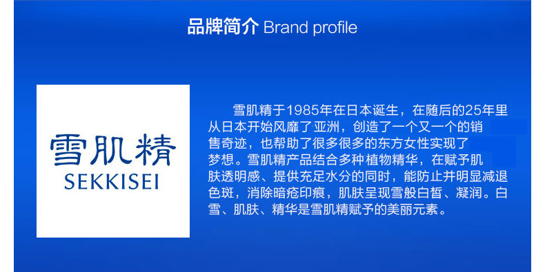 全新触感:滋润而不黏腻,深入滋润角质层,用后肌肤清爽而有弹力。含五种和汉植物精华,如旋覆花、牡丹皮、薏仁、当归及白蔹,有效地提高肌肤透明感。含水分平衡聚合物,因应季节、