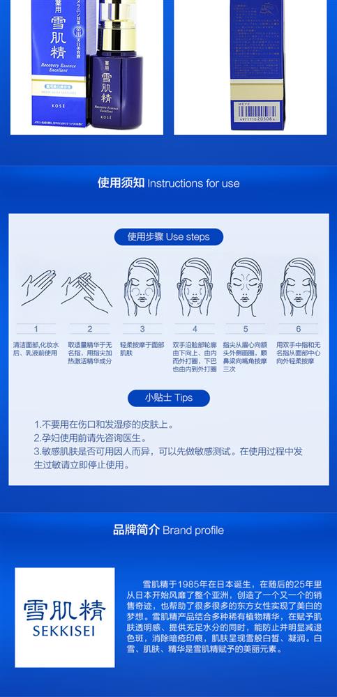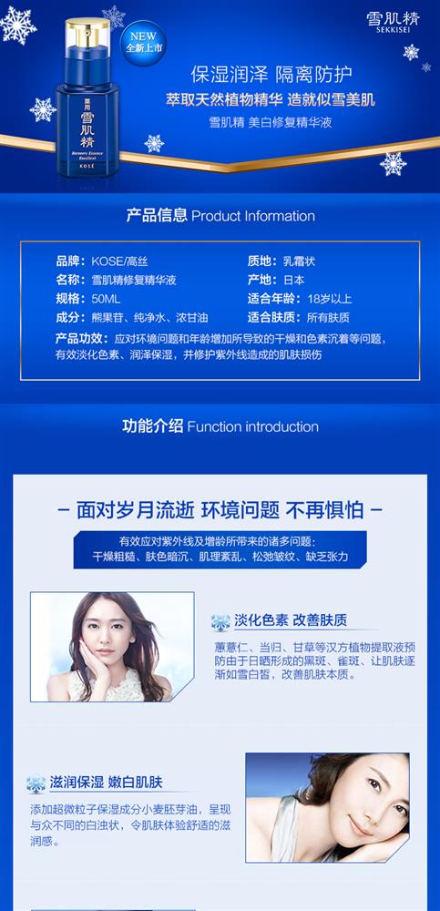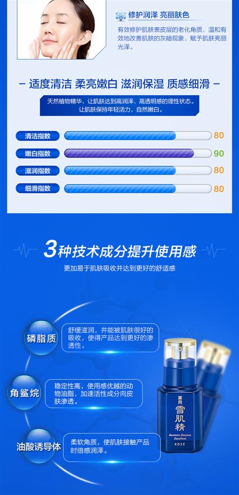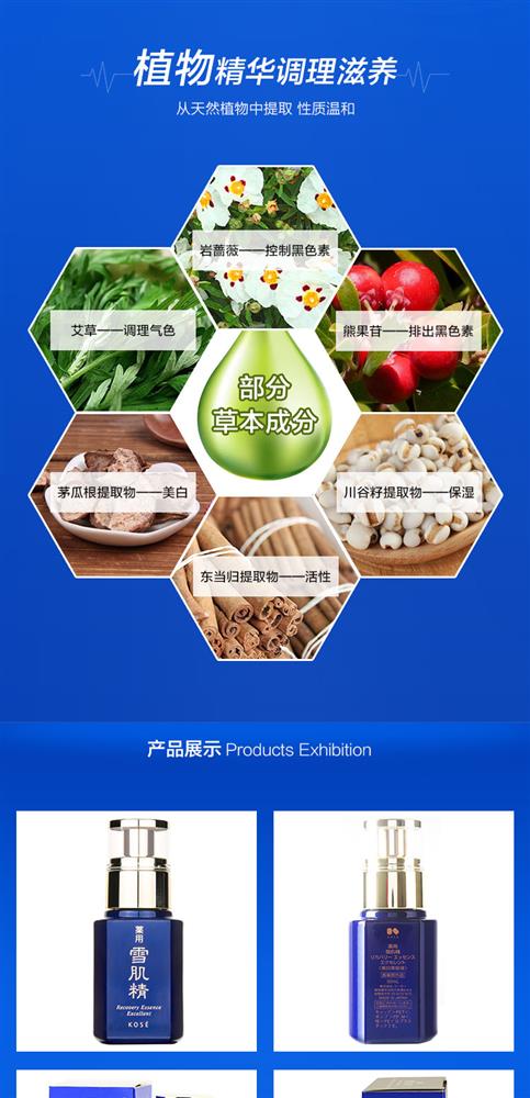 含薏苡仁、当归、白蔹、旋覆花、牡丹皮等多种汉方植物提取液,特别值得骄傲的是—采用了具有卓越美白效果并且在雪肌精系列中初次登场的金银花提取液。
