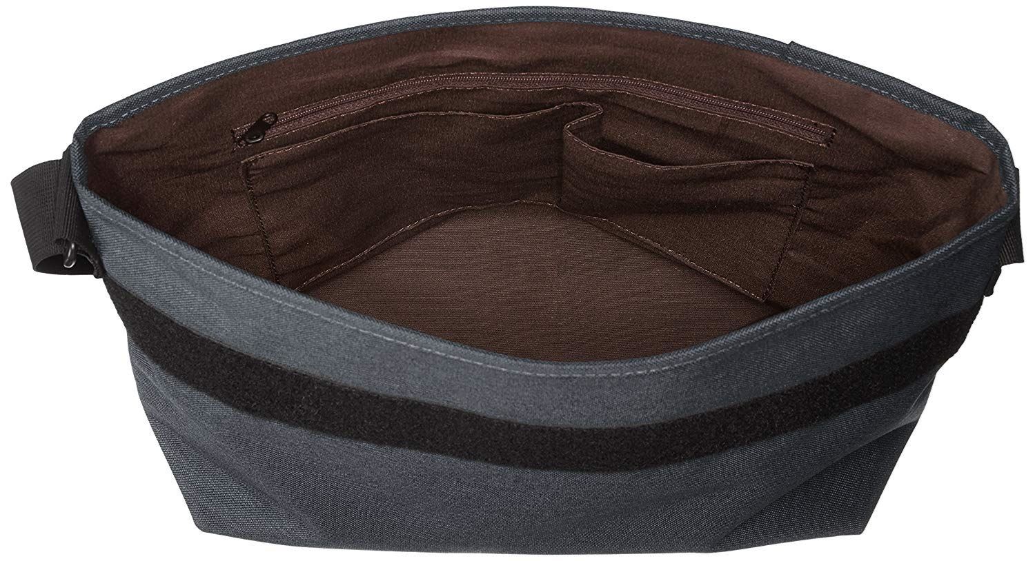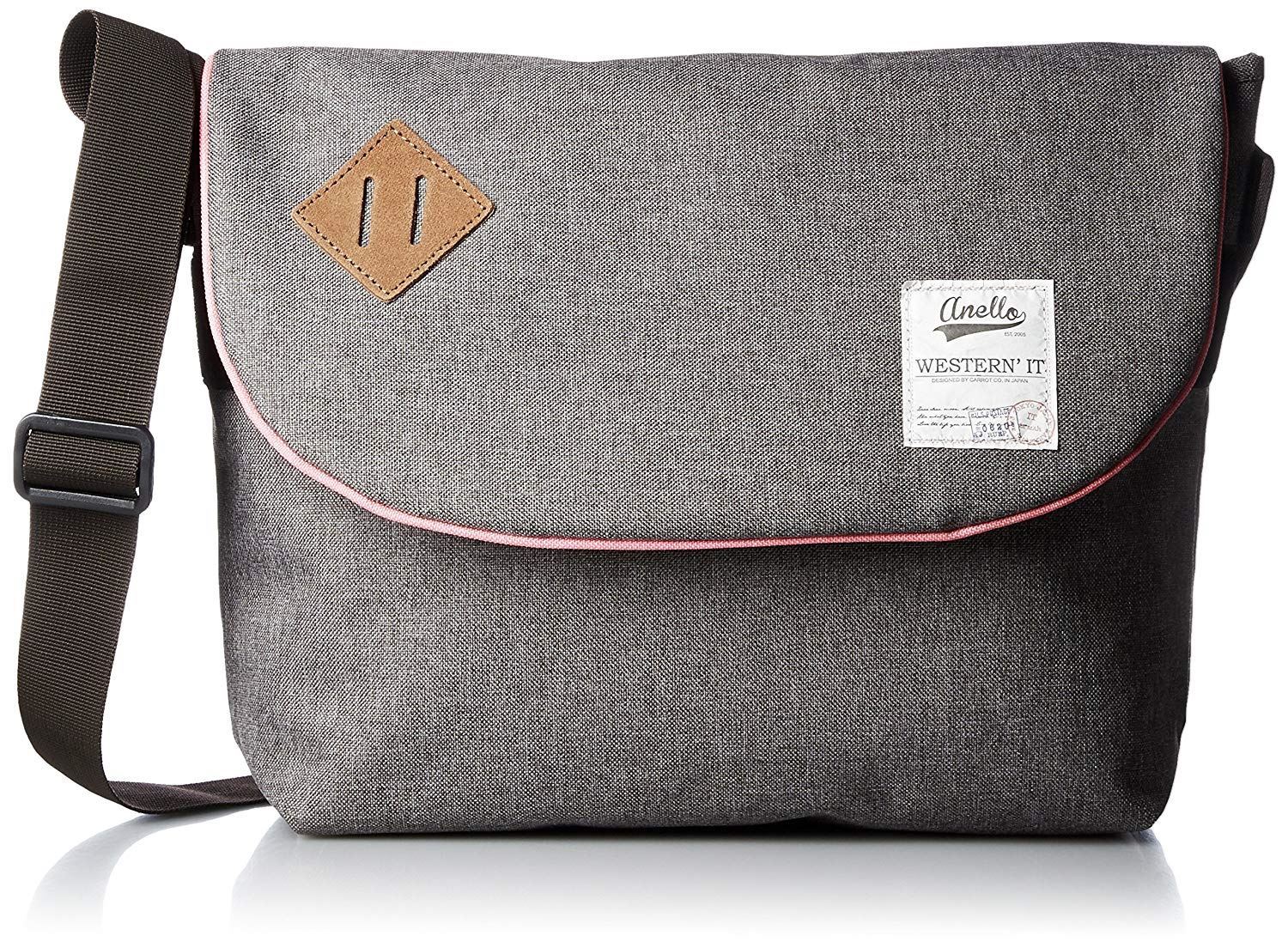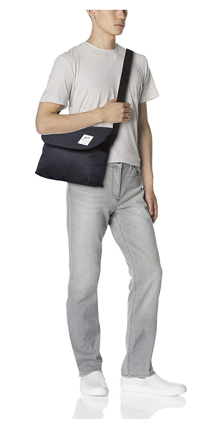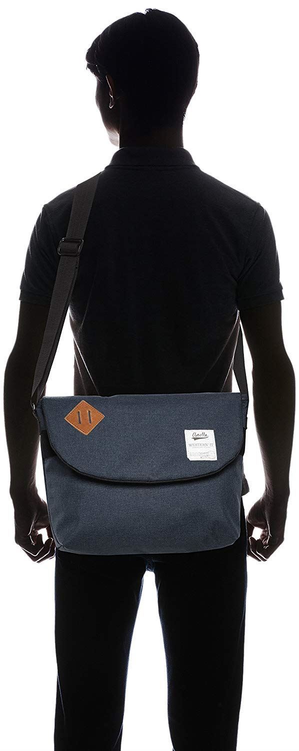 使用混合色调风格面料的邮差包。
