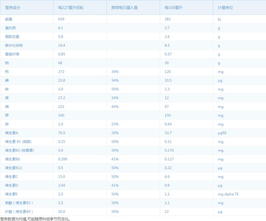 产品概述: 适合12个月以上的宝宝。 有机奶源。 添加钙、铁、锌。 产自澳大利亚。 由NASAA权威认证。 包装罐不含双酚A(BPA)。