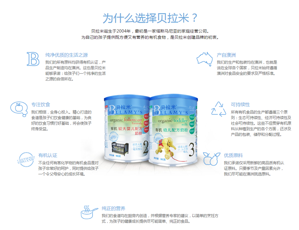 贝拉米有机幼儿配方奶粉奶源获得有机认证,同时富含铁及其他23种儿童快速成长所必需的营养物质。因此可以有效地补充成长中儿童对各种营养物质的需要。