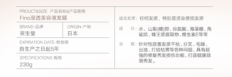 日本 资生堂Fino渗透美容液护发膜 230g