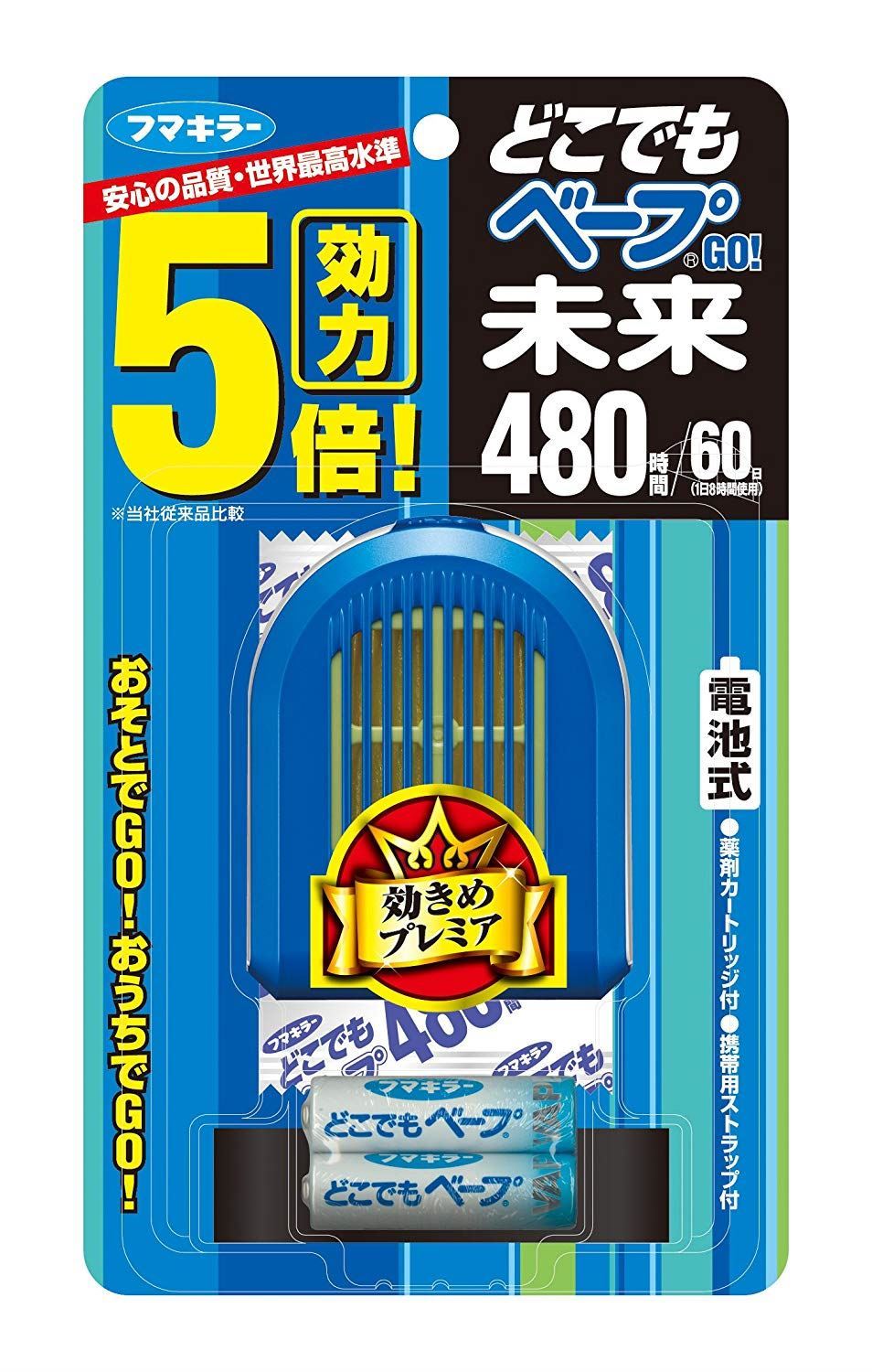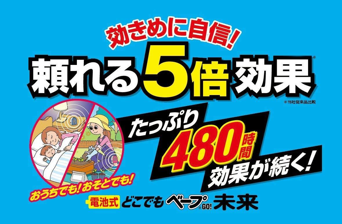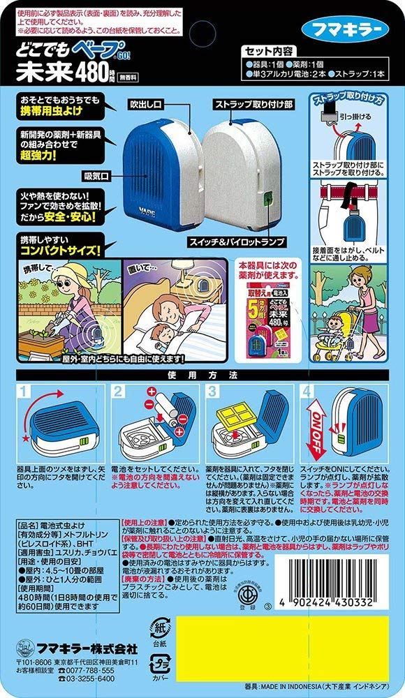 ※携带用电池式的驱虫效力●效力大幅度提升!含高浸量药剂的针头和高散发药剂风扇的力,实现了5倍的效力,屋外大约也发挥了98%的驱虫作用。●电池没了还有药剂没了就一次更换,安装很简单。安装带子也简单! ●款式小巧!携带方便,底部平坦,在室内放置也可以。吸气部分的设计,粉色可爱款,蓝色流行款,鲜明的条纹,有着鲜艳颜色的存在感。 ●可持续工作480小时!用风扇发挥药剂,使用起来更安全,480小时发挥着效力。
